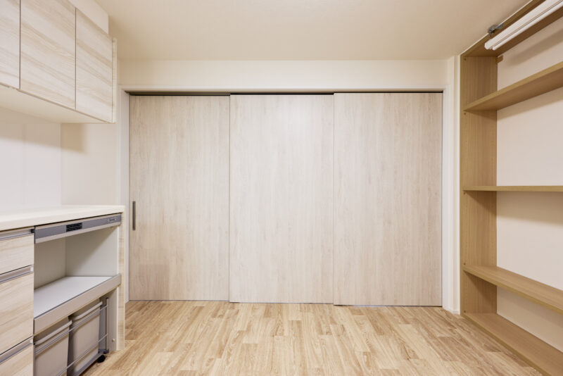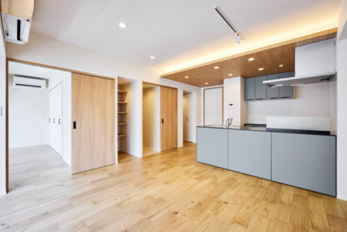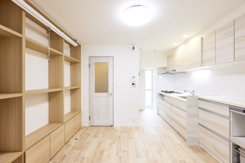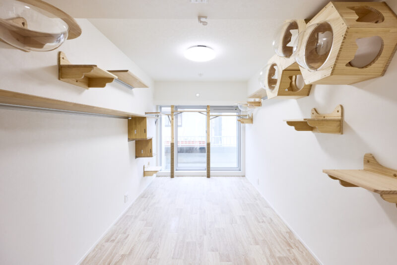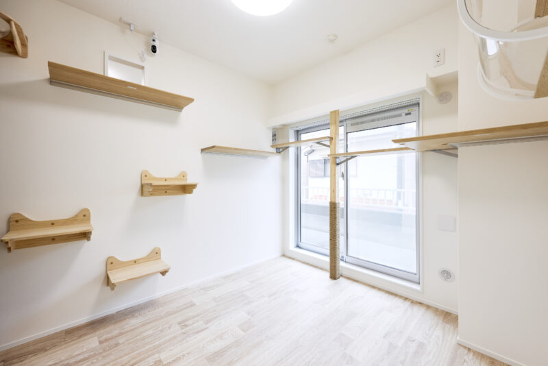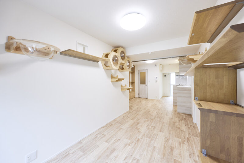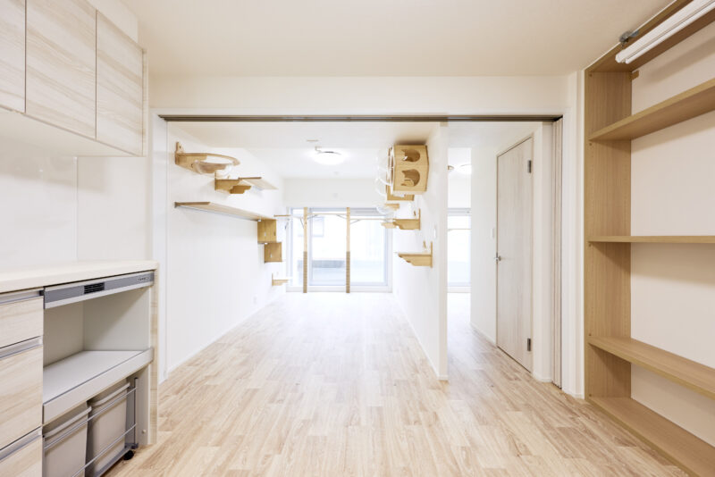 大きな特徴は、キッチン・リビング・寝室をつなぐ3枚の仕切り扉。オープンにすることで猫が自由に行き来できるだけでなく、一つの空間として開放感があり、空調も1台でまかなえる効率的な設計になっています。また、24時間換気や、除湿・換気もできる空調を取り付けるなど、設備面でも愛猫に配慮。デザインはお施主さまがお好きな無印良品の世界観に合わせ、ナチュラルに明るく仕上げています。