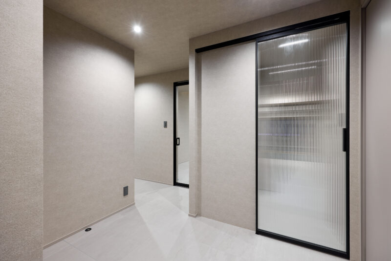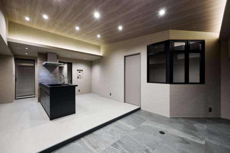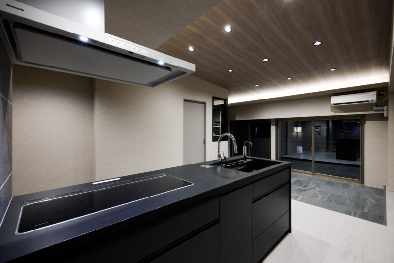 ご夫婦が思い描いていたイメージをベースに、テーマは「アーバンモダン」。 グレーを基調に高級感を演出し、黒を取り入れた存在感ある大きなキッチンや、重厚感のあるグレーの建具でデザイン性を高めました。 また、自宅で仕事をされることが多い奥さまのために書斎を設け、室内窓で光を取り込みながらシックな雰囲気の部屋に。さらに設計士の工夫で天井をできる限り高くし、開放感のある広々とした空間を実現しています。
